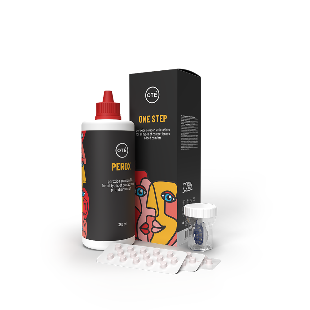 Waterstofperoxidesysteem voor zachte en harde contactlenzen in combinatie met neutralisatietabletten.